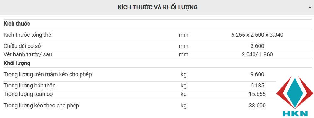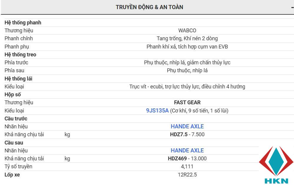 - Hệ thống treo phụ thuộc nhíp lá phía trước và sau, cùng cầu HANDE AXLE chịu tải cao, mang đến khả năng vận hành ổn định và đáng tin cậy.