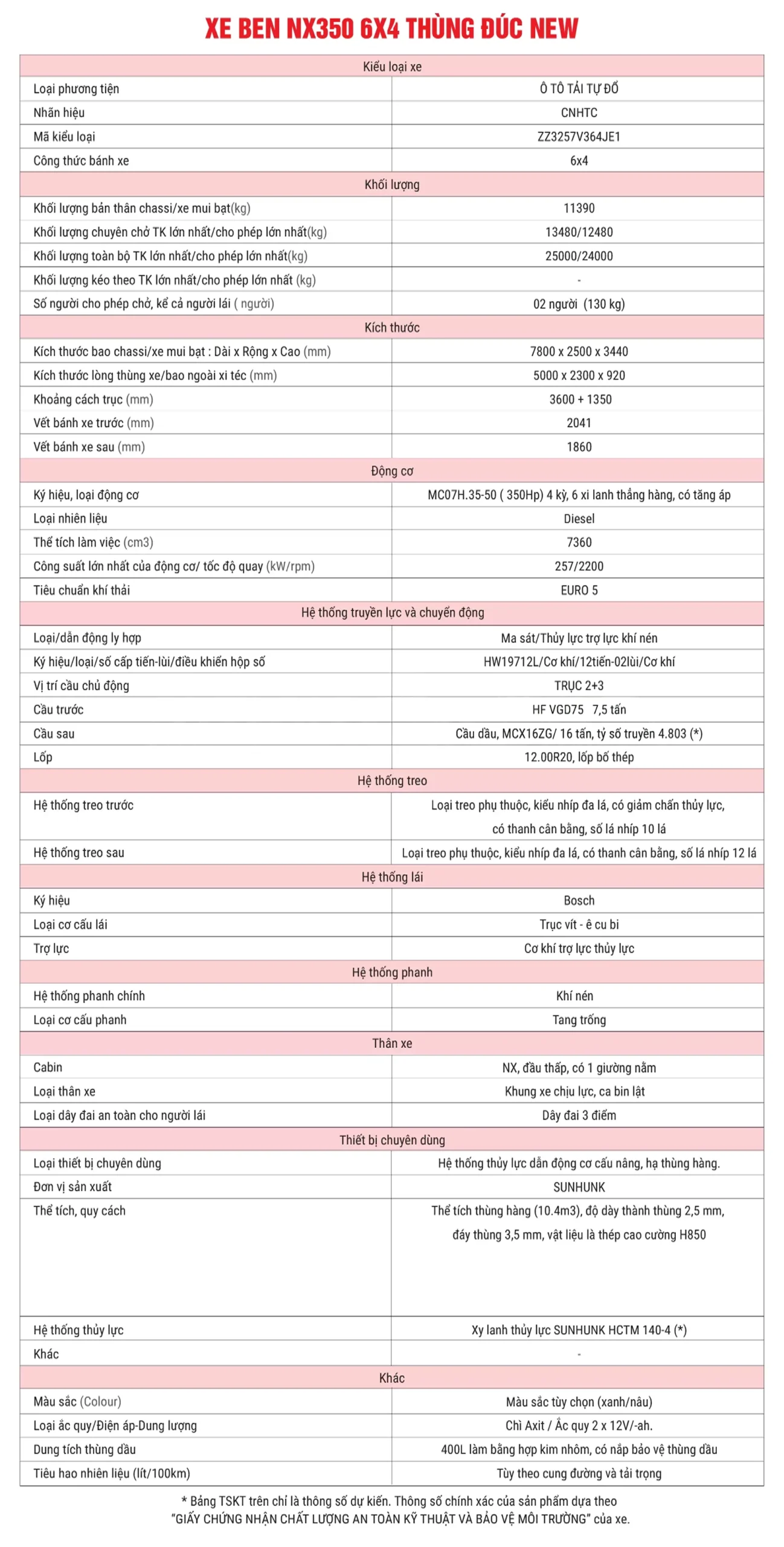 HOWO NX350 6×4 thùng đúc thuộc dòng HOWO N series (nâng cấp từ VX), sở hữu ngoại quan khỏe khoắn, nội thất tiện nghi và cấu hình truyền động tối ưu cho vận tải nặng tại công trường, mỏ vật liệu. Xe dùng động cơ công nghệ MAN, thùng đúc từ vật liệu thép cao cường, hệ thủy lực ben bền bỉ và sắt xi gia cường, giúp tối ưu chi phí vận hành cho doanh nghiệp.