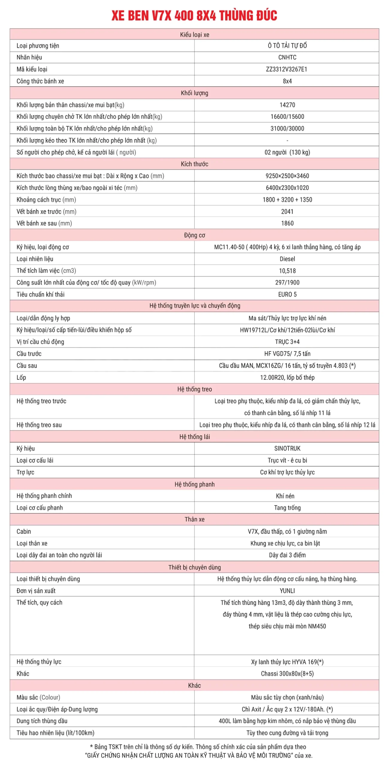 Với ngoại quan mới, nội thất tiện nghi và cấu hình truyền động bền bỉ, HOWO V7-X 350 8×4 thùng đúc là lựa chọn đáng cân nhắc cho doanh nghiệp cần một mẫu xe ben 4 chân mạnh mẽ, tiết kiệm và ổn định khi khai thác ở công trường, mỏ và các tuyến vận chuyển vật liệu nặng.