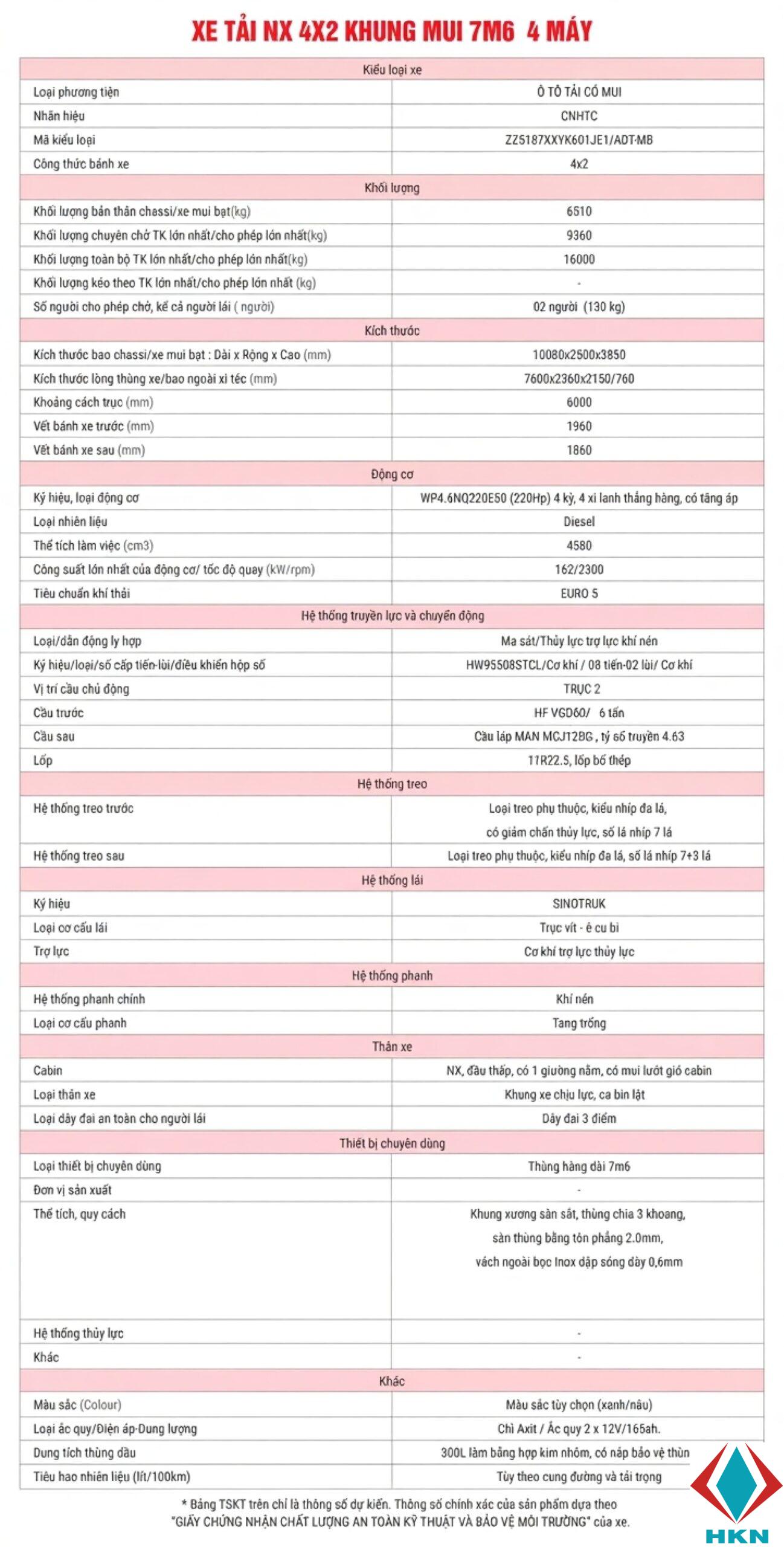 HOWO NX 4×2 khung mui 7.6m kết hợp ngoại quan hiện đại, nội thất tiện nghi chuẩn châu Âu, động cơ Euro 5 tiết kiệm – mạnh mẽ cùng hệ truyền động bền bỉ. Đây là lựa chọn hợp lý cho doanh nghiệp cần xe tải trung chuyển đa nhiệm, ổn định và tối ưu chi phí vận hành.